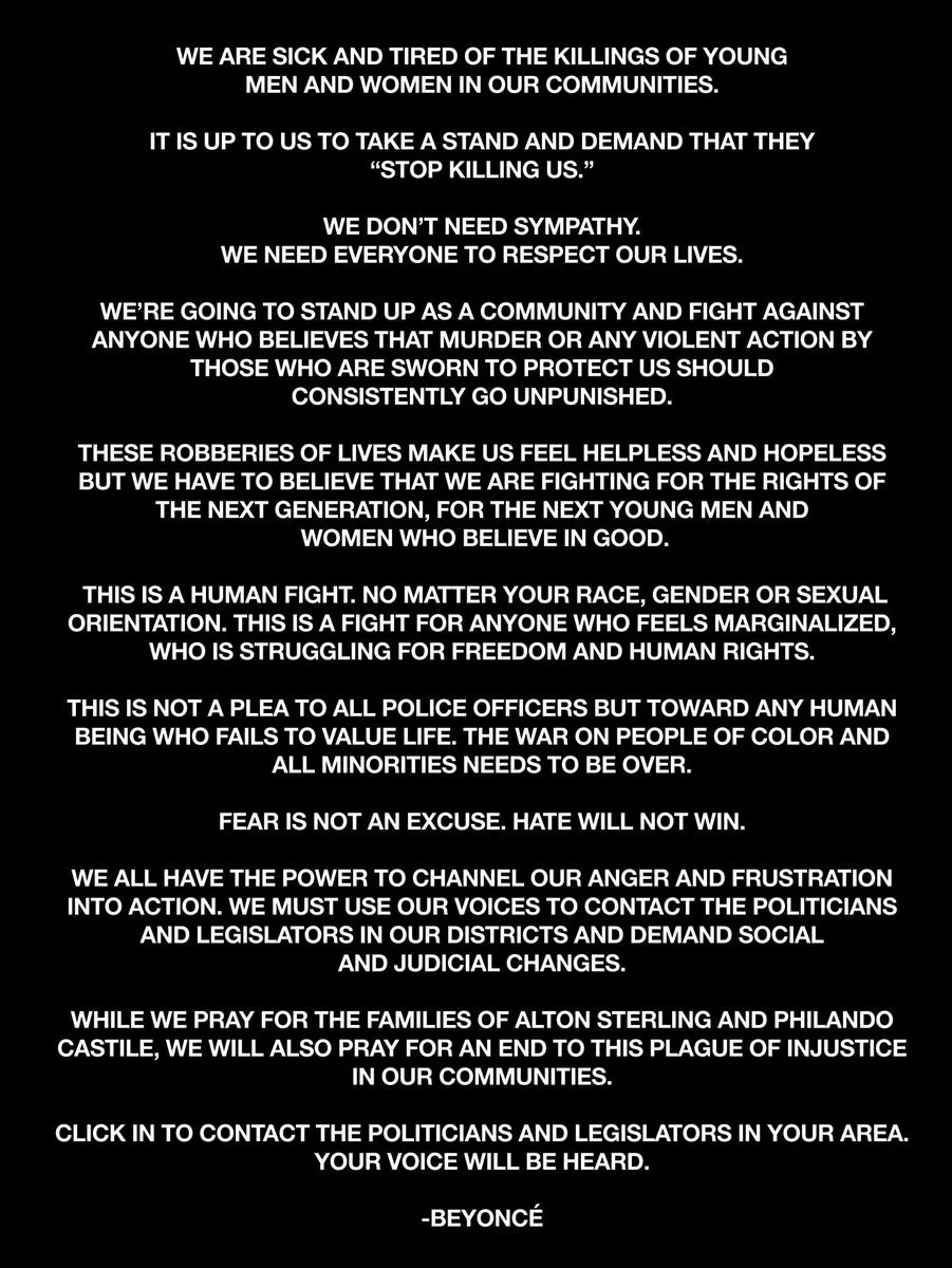 Beyoncé, Jay-Z’s wife, posted the statement below to her website which responded to the killings of Alton Sterling and Philando Castile.